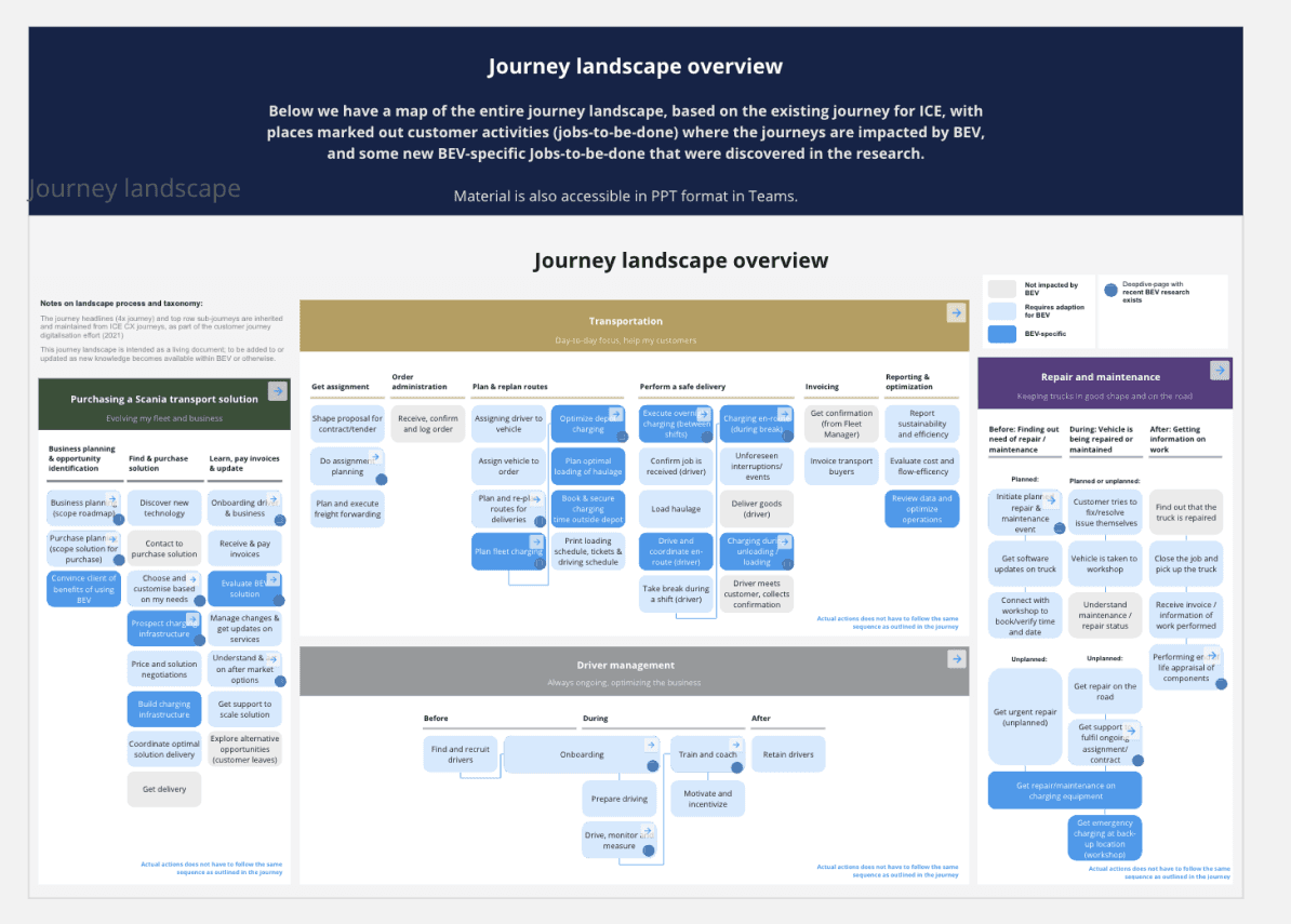 We mapped CX and EX insights across each part of the journey landscape to identify areas with most and least change due to electrification.