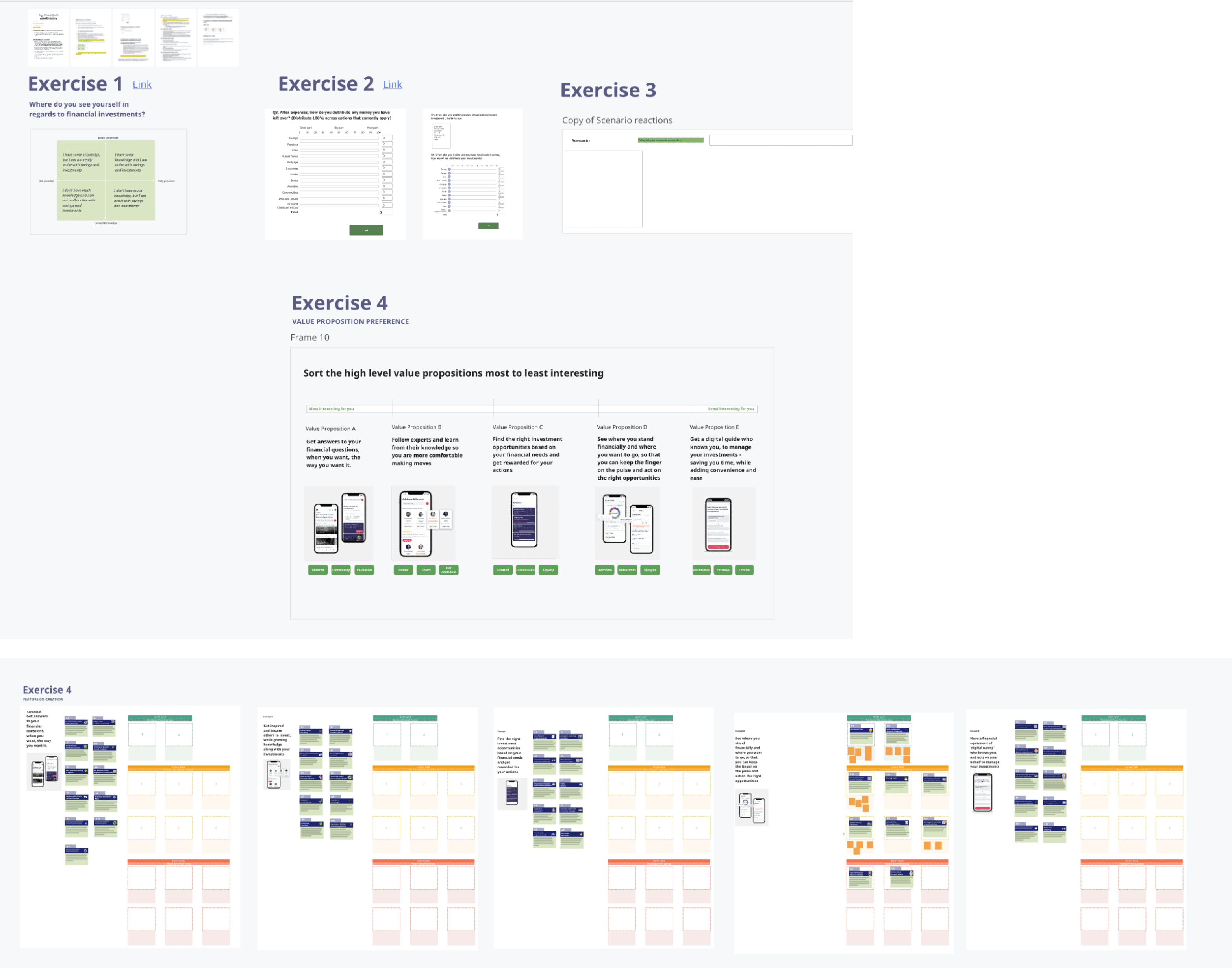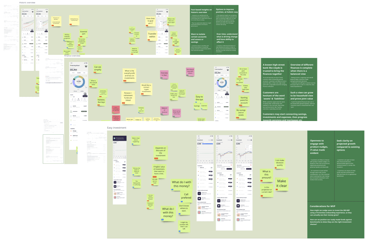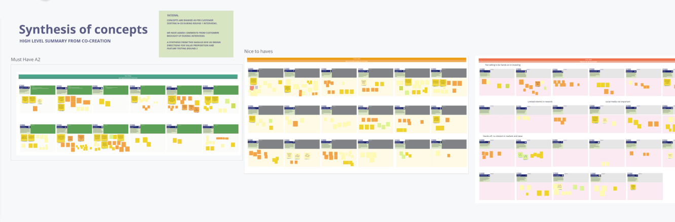 Clustering qualitative input from all interviews to draft feature requirements for investment and banking related products.