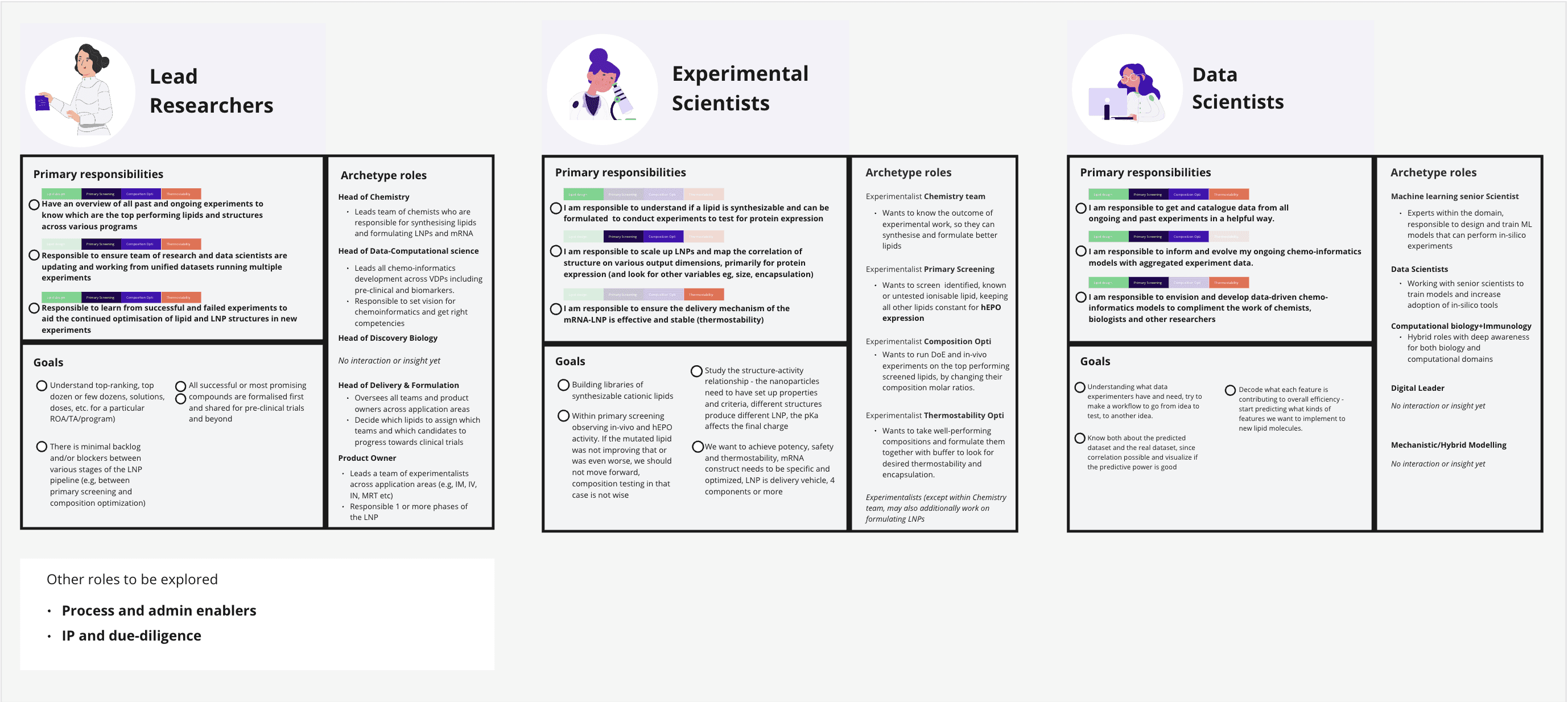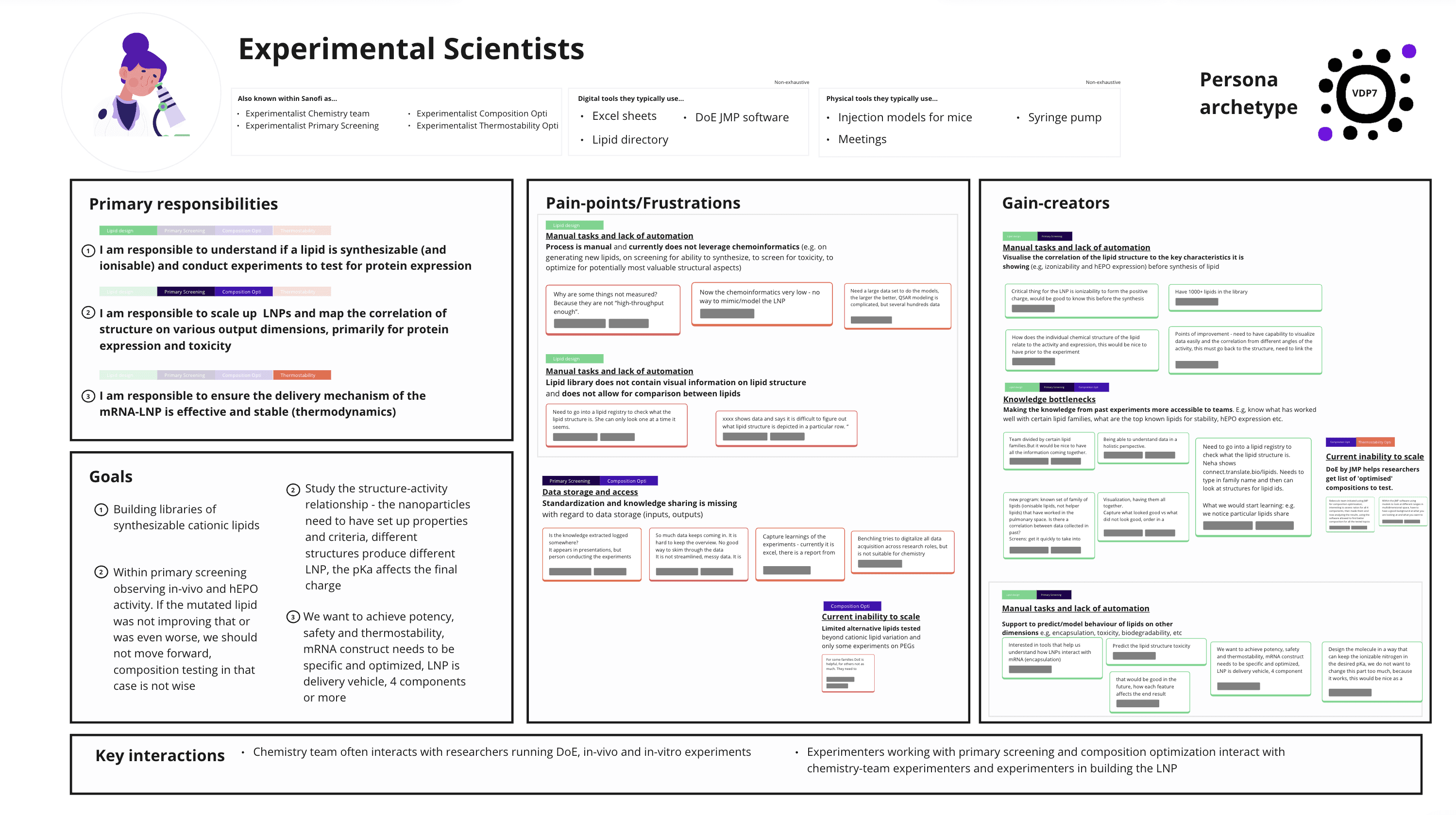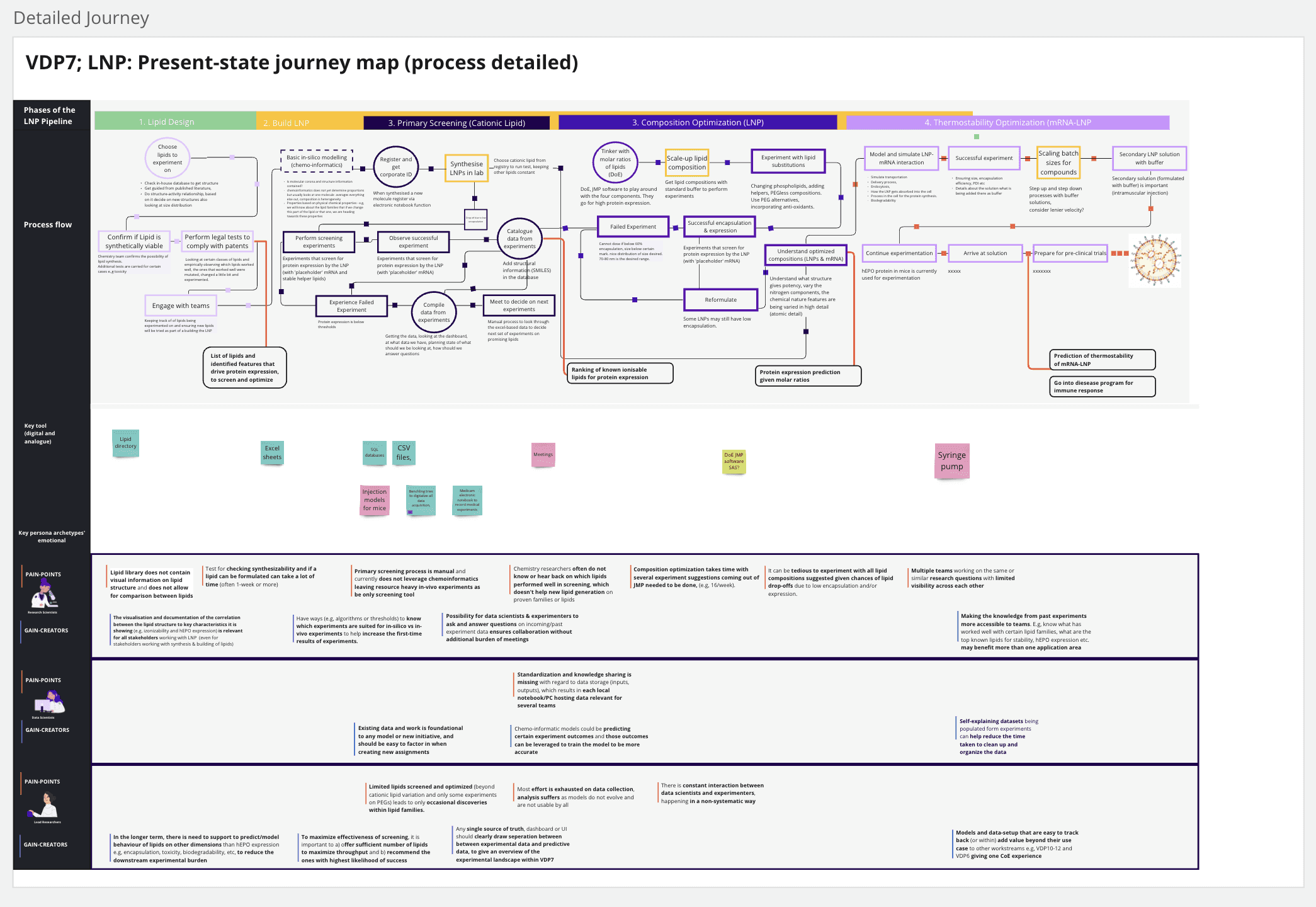 Insight synthesis of key personas across the mRNA-LNP design workflow including key responsibilities, pains and delights.