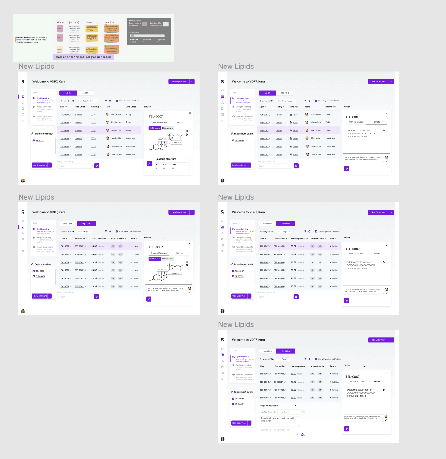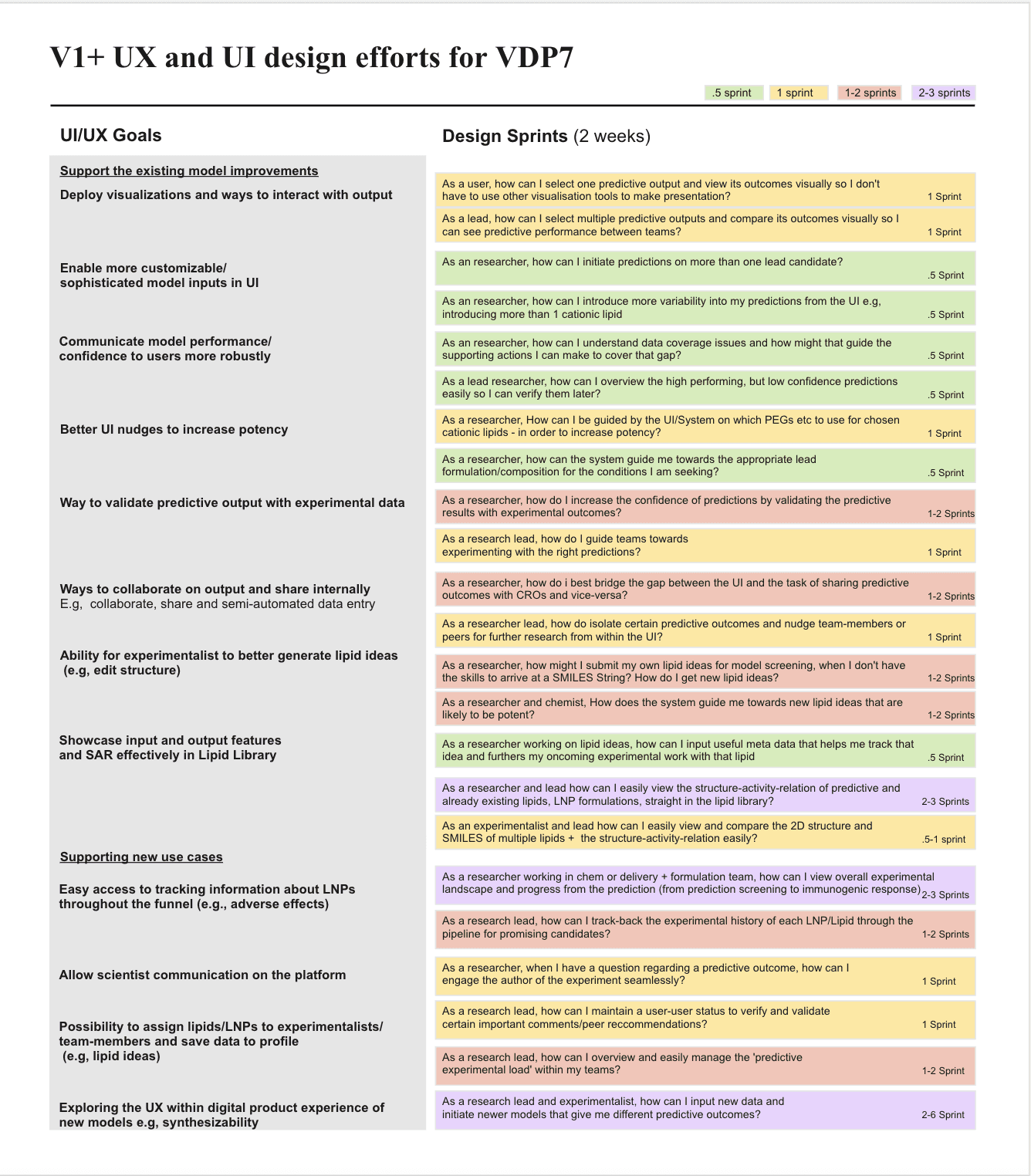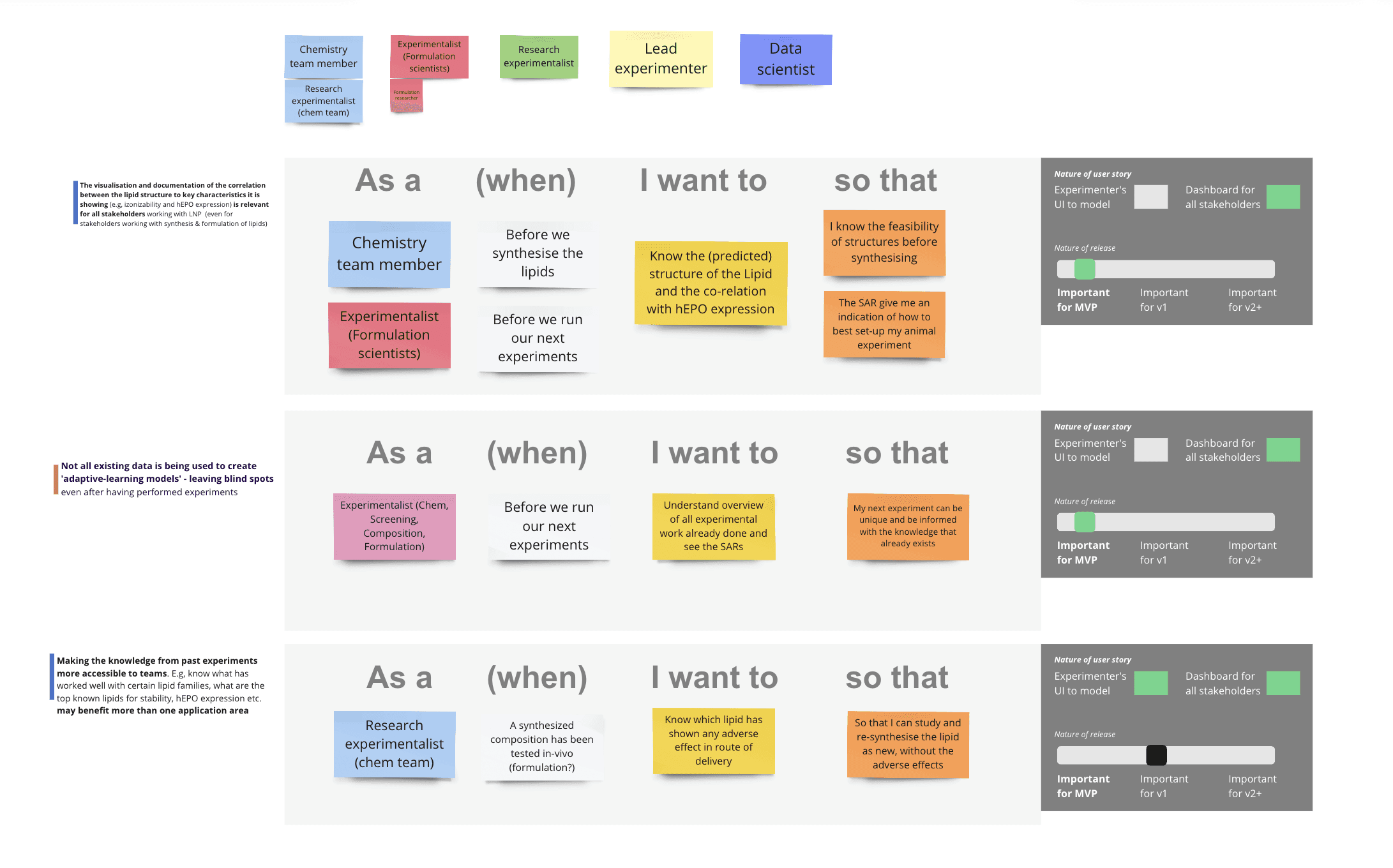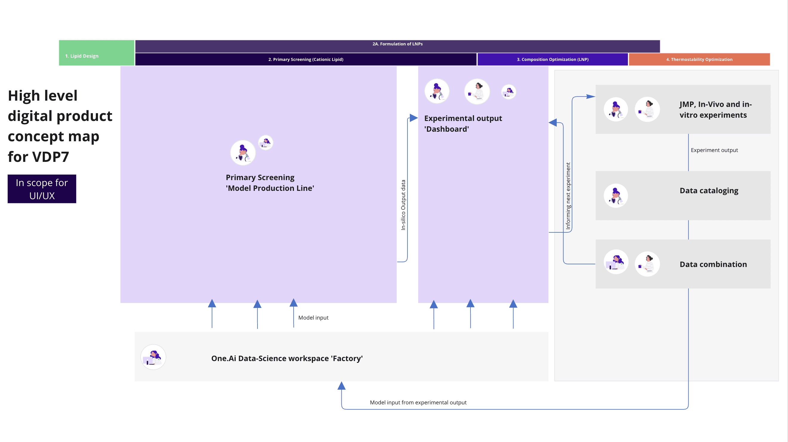 Insight synthesis of key personas across the mRNA-LNP design workflow including key responsibilities, pains and delights.